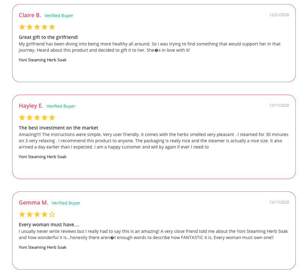 I usually never write reviews but I really had to say this is an amazing! A very close friend told me about the Yoni Steaming Herb Soak and how wonderful it is...honestly there aren't enough words to describe how FANTASTIC it is. Every woman must own one!!